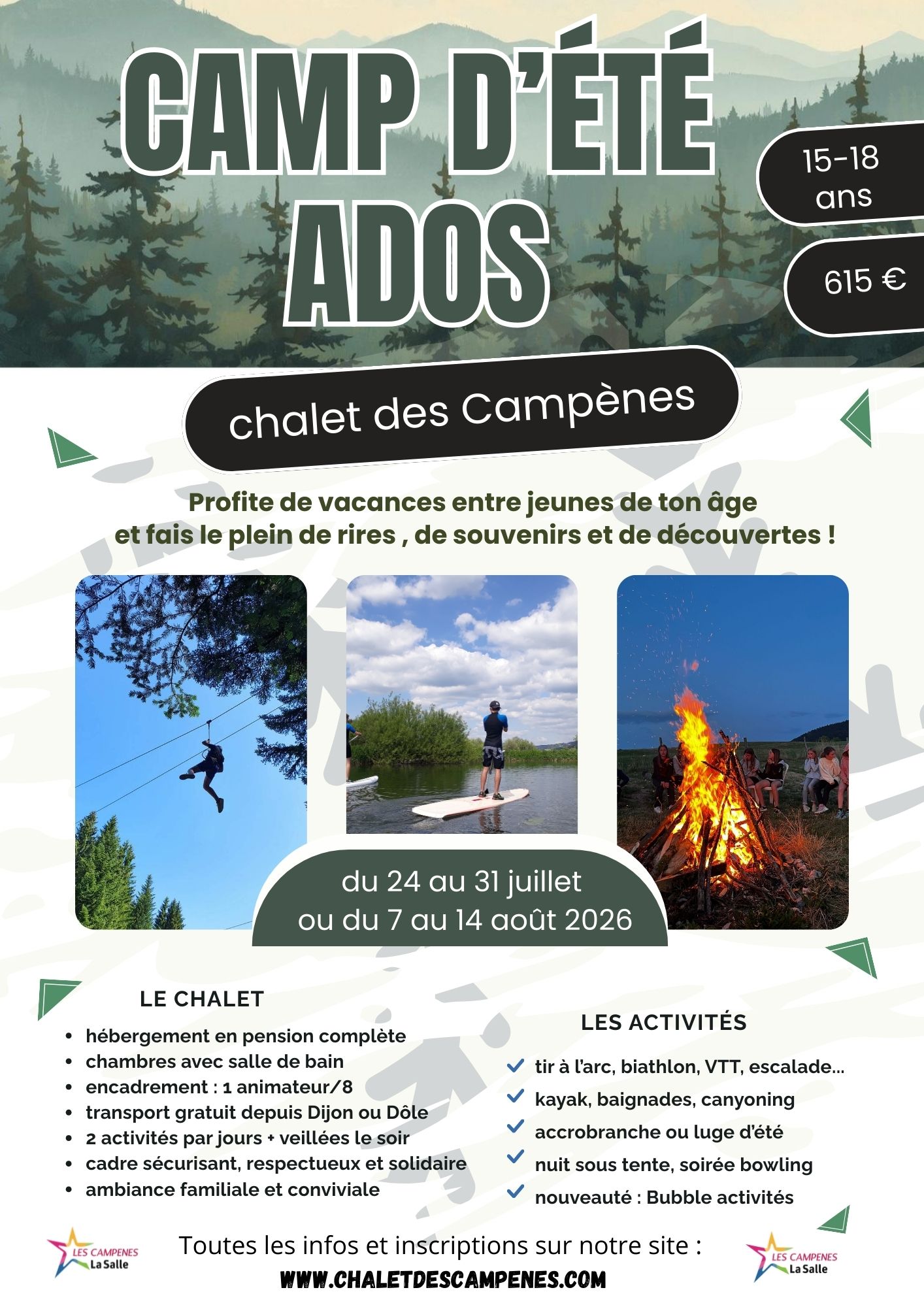 - Nous remercions toute votre équipe d'animateurs pour cette semaine fantastique, c'est la meilleure colo jamais faite pour mon fils : des activités de plein air nombreuses, variées, sportives comme il en rêvait, un encadrement vraiment gentil, un lieu de vie génial. Lui et ses nouveaux amis se sont donnés rendez-vous l'année prochaine aux Campènes. Très bel été à vous tous !